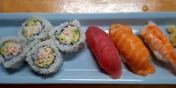 California roll 4 pcs, 1 pcs each nigiri sushi of tuna, salmon, shrimp